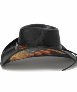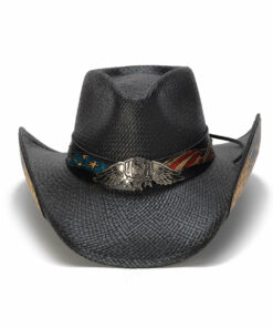 Black Eagle Straw Cowboy Hat, It has a 3 1/2†brim and a 4 1/4†pinch front teardrop crown. It features a quality Panama Straw and USA logo with wings and stars buckle. This one-of-a-kind piece makes a bold statement of patriotism.Lightweight and durable, it’s unlined for breathability.