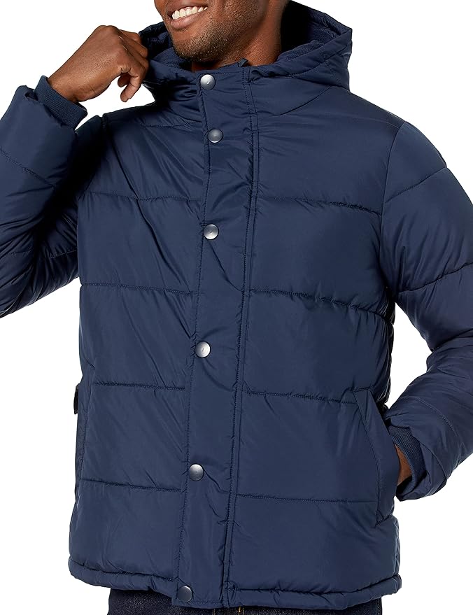 - COLD-WEATHER STYLING: Stay warm in this versatile water-resistant puffer jacket featuring a full-length center front zipper and hood.