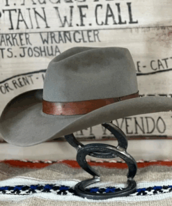 It has a low profile Gus creased crown that is 4.75″ in the back and slopes to 4.25″ in the front. The 3.75″ brim has a small pencil curl on the sides and a nice slope in the front and back. It is topped off with an antique looking leather hat band. We really like this one with its unique look and versatility.