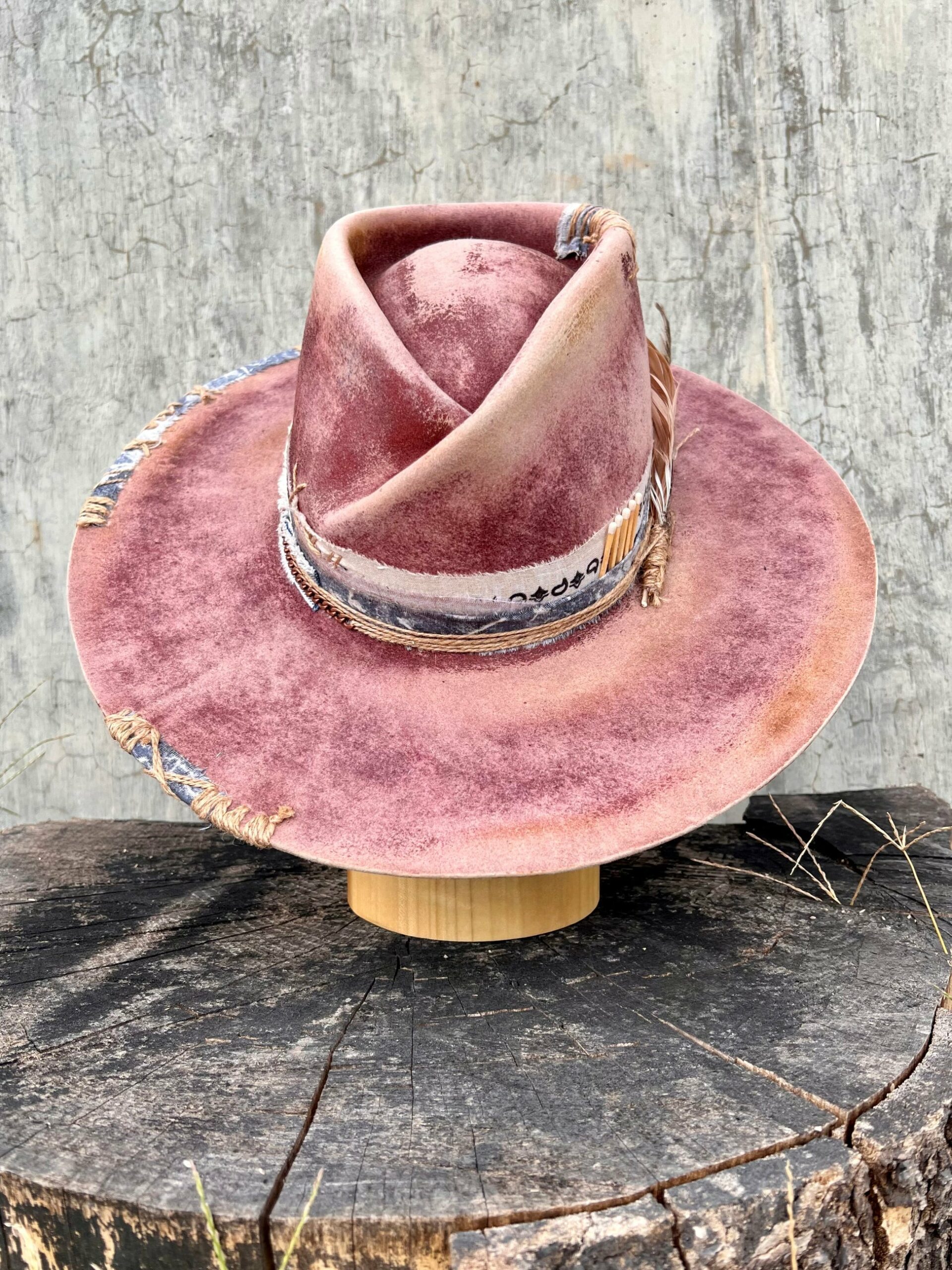 All vintage-style hats are hand-distressed, hand-dyed, and hand-torched, ensuring no two share the same color or design. Each piece is uniquely imperfect, with subtle variations from product images.