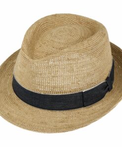 Made from 100% straw, this hat has an attractive crochet look and fits harmoniously into the summer leisure wardrobe. The chic hat can be flexibly combined with a linen suit or jeans and a T-shirt. A wide denim-look trim band with a contrasting braid gives the Italian-made straw hat a particularly casual look.