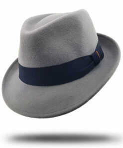 Supple wool felt gives this hat its pleasant feel and, together with a skin-friendly lining made of cotton, makes it comfortable to wear. The plain design of the felt hat with narrow brim is complemented by a subtly striped grosgrain ribbon trim with brand pin, which emphasises the hat’s neat charm. This trilby can be worn on everyday outings, but also makes a great club hat.
