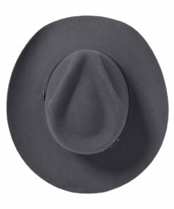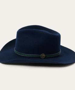 Handcrafted from high quality wool felt for a sturdy finish and unique style. It has a 4 1/4-inch pinch crown, 3 1/4-inch brim, and a three-cord braided leather hatband with buffalo nickel pins.